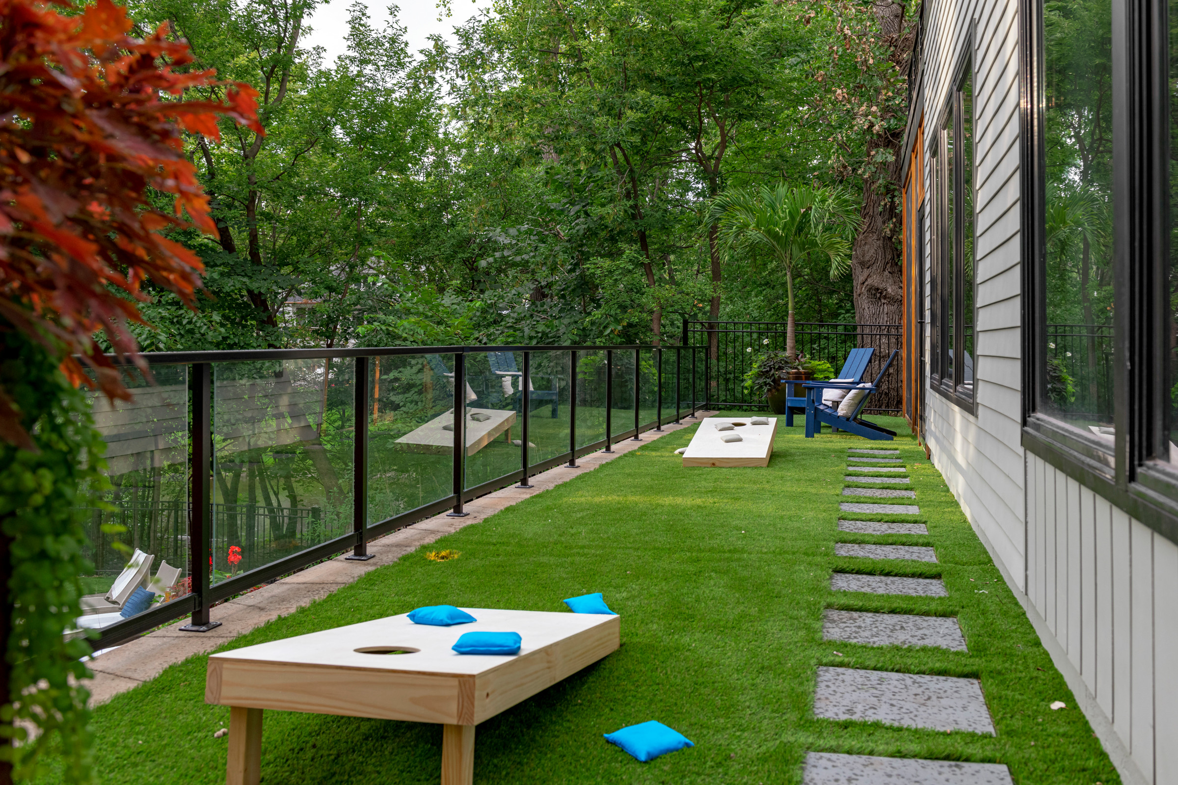 On this Minneapolis balcony, Mom’s Design Build created a great spot for a game of cornhole. In addition, a few well-placed Adirondack chairs provide spots for taking in nature, reading a book or watching the players.