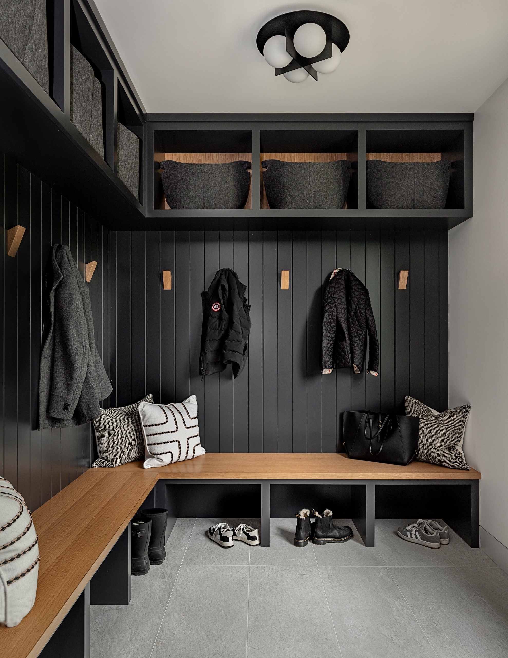 Mudroom storage features. “We designed a comprehensive solution featuring a bench with integrated hooks to organize coats, jackets, leashes and backpacks, complemented by accessible shoe storage suited for children’s independent use,” Bassett says. “The opposite wall provides closed storage cabinets dedicated to off-season outerwear for all family members, maximizing the mudroom’s functionality while maintaining a clean aesthetic.” The built-ins are painted Ebony King by Benjamin Moore. The bench is oak. The flooring is porcelain tile.
