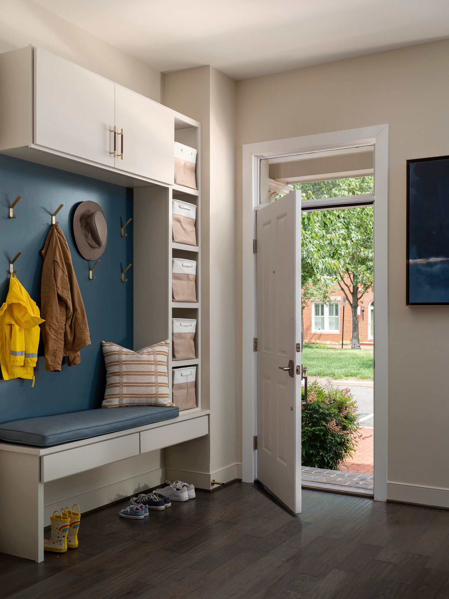 Homeowners’ request. “The clients did not have an overall theme, but they tended to go toward midcentury style but wanted some bold pops of color,” designer Stacey Dobrovolny says. “The clients needed to maximize space because every inch counts in this three-story row home. The home is not very wide but rather long. They needed a drop zone by the front door where they could keep things looking neat and orderly but also functional and with as much storage as possible.”