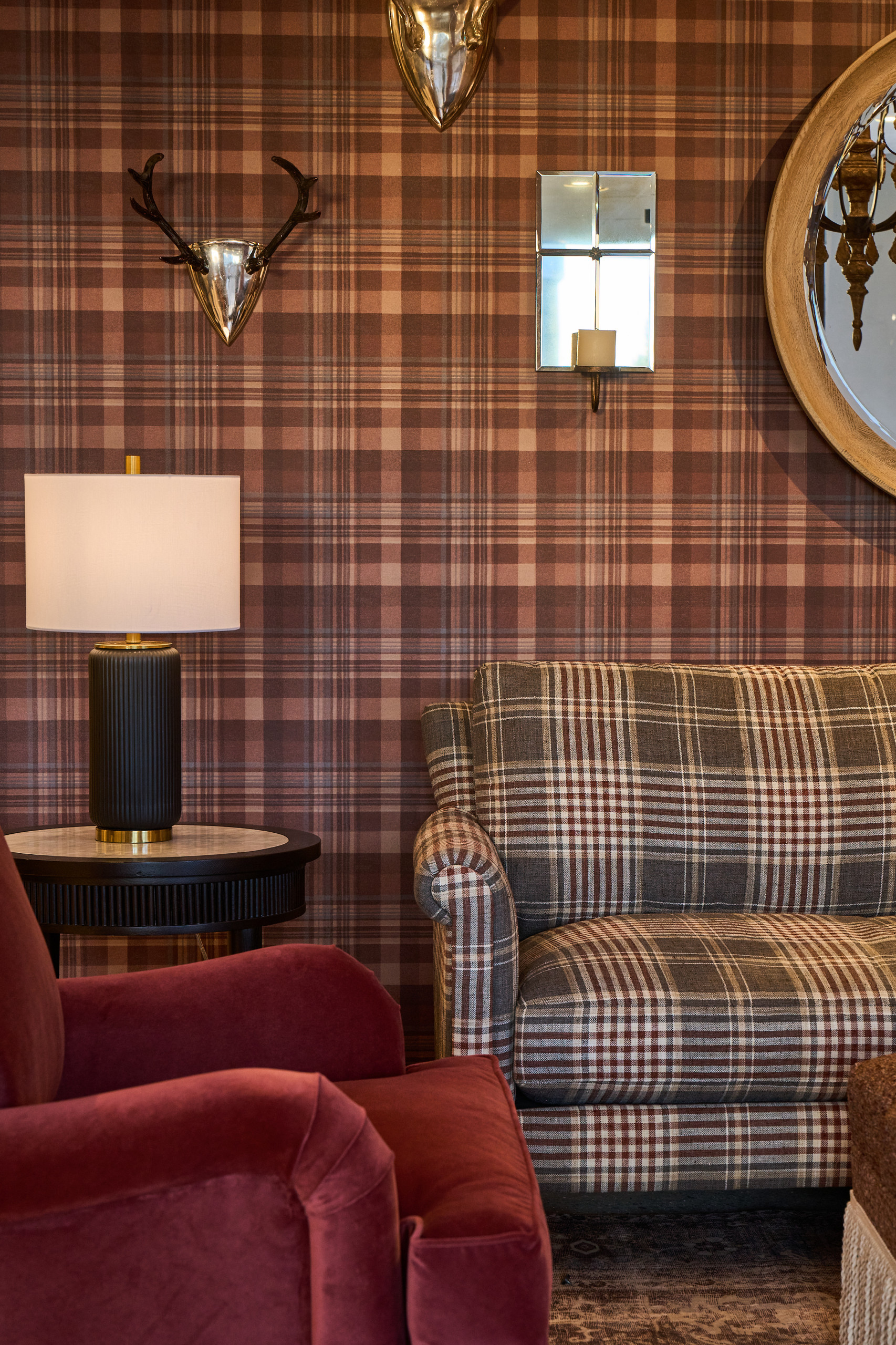 Looking ahead to 2026, we expect plaid to be used as both punctuation and the main pattern in rooms: on a pillow, a chair back, wallpaper or even an entire sofa. Fairfield’s Flynn sofa, pictured here in front of a wall covered in plaid, doubles down on the trend.