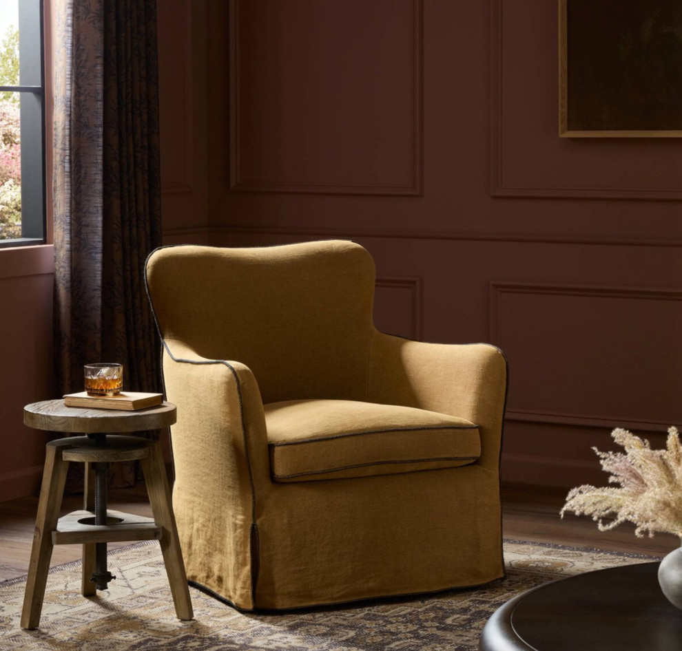Visible stitching, decorative trim, fringe, bold piping and other detailing took a front seat at the market, going beyond being decorative extras to become integral to the design of a piece. The contrasting stitching on this Four Hands Devon slipcover swivel chair, which emphasizes the chair’s lines, is a comfy, casual take on the trend.