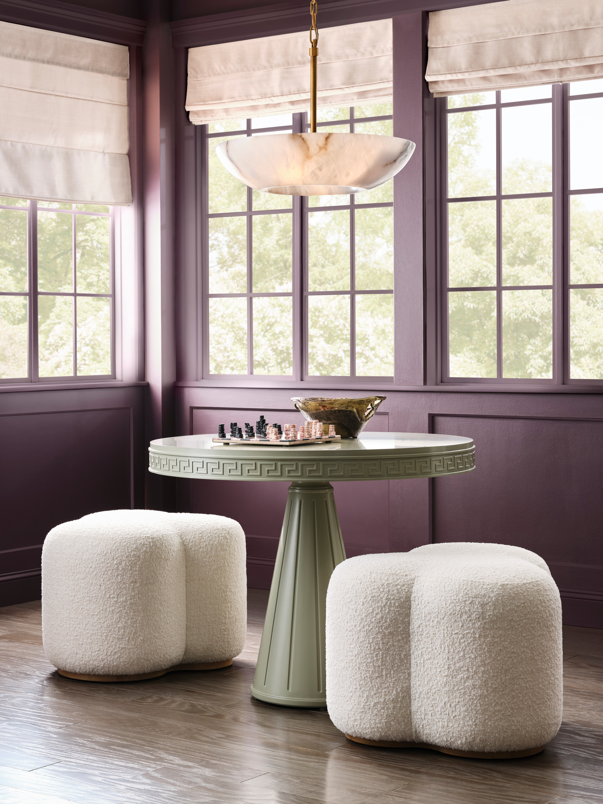 A very specific curvy (and cute) shape that suddenly seemed to be everywhere was the clover. Trefoils and quatrefoils popped up in wallpaper and fabric patterns, in lighting, as seat backs and as ottomans, like the Andrea from Wildwood pictured here. We’ll be curious to see if the shape is back in the spring.