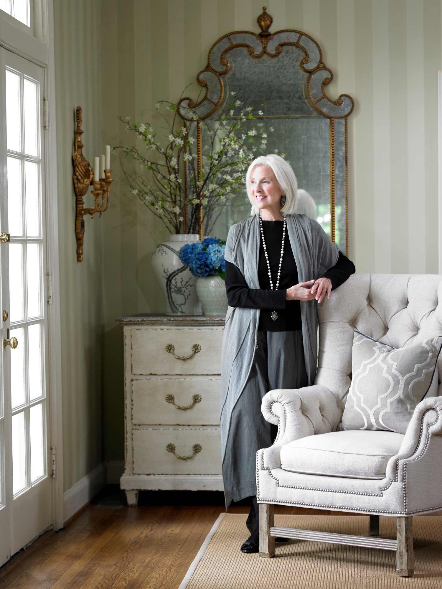 Another notable market launch focused on traditional design was the Antiquaire collection from Sherrill Furniture’s Lillian August brand, which was inspired by 18th- and 19th-century French and Swedish furniture. Here, designer August is pictured in front of the collection’s Iris Serpentine chest, which has a convincingly weathered-looking paint finish.