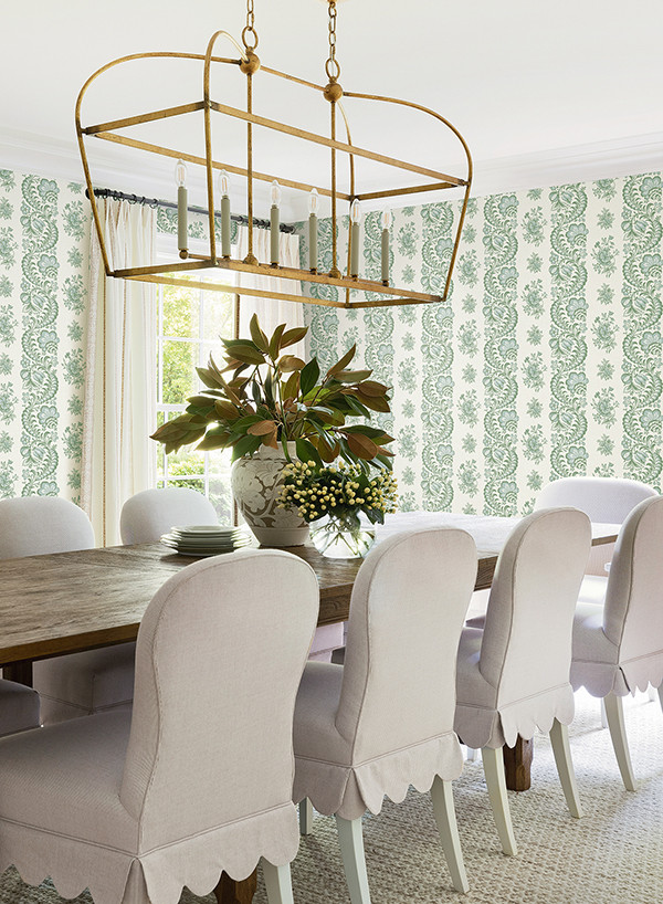 For example, York Wallcoverings’ Beaumont floral stripe wallpaper, seen here, was inspired by vintage prints made with artisanal block-printing techniques. (Also notice the skirted dining chairs — another traditional detail seen at the market.) Other popular botanical patterns in both wallcoverings and fabrics featured cabbage roses, peonies and Art Nouveau-inspired ginkgo leaves, which popped up beside the chinoiserie prints we’ve seen in the last few seasons.