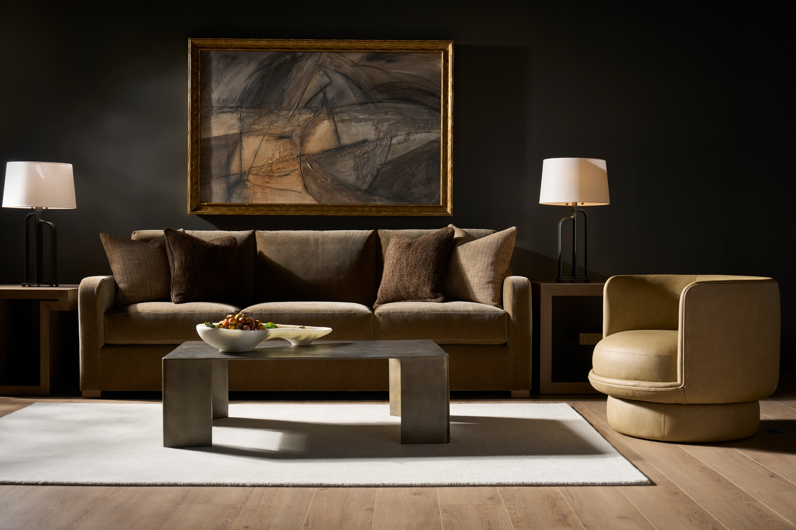 This vignette from Universal Furniture featuring the Deke swivel chair and Filmore sofa captures the browns, earthy yellows and dark, warm metallics prevalent in many showrooms. Many browns had either purplish or gray undertones — the latter being versatile enough to play nicely with either warm or cool tones.