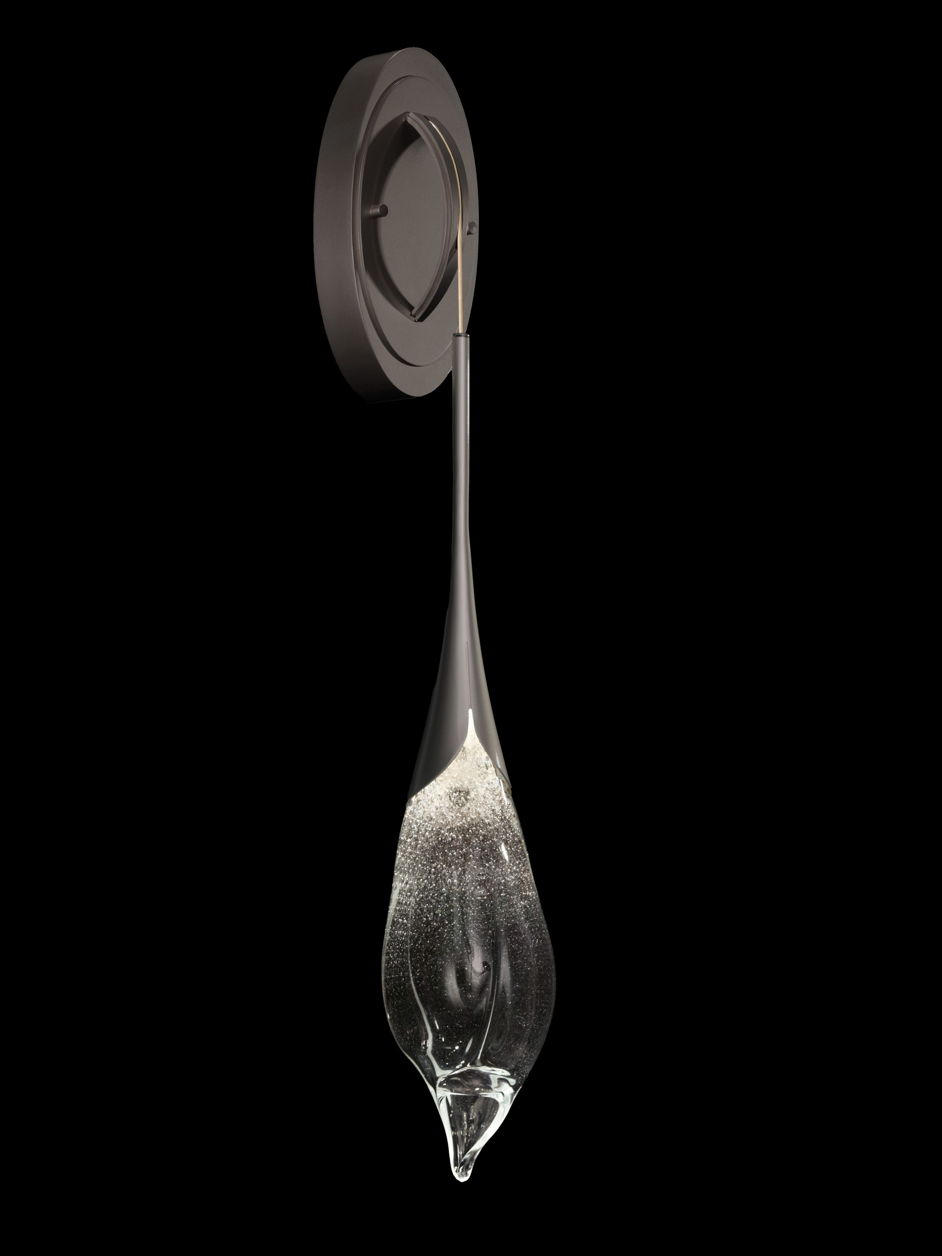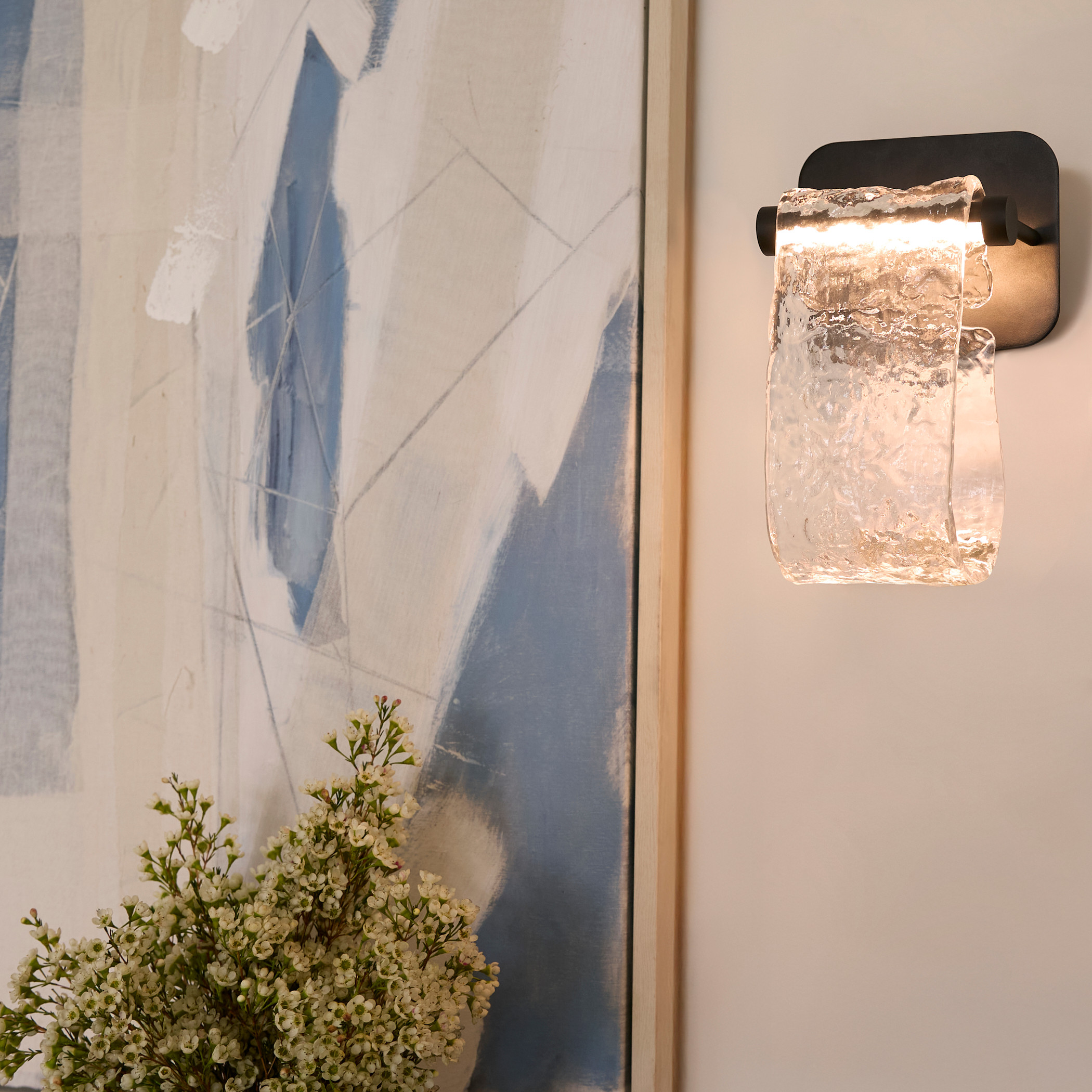 This sconce from Oxygen’s Veer collection, inspired by the cascading sheets of water at Frank Lloyd Wright’s Fallingwater, is an example of the melted-looking glass that appeared on pendants, chandeliers and sconces in showroom after showroom. Hubbardton Forge’s Riverbed collection was another captivating example. The mottled surface catches and scatters light in subtle ways, turning fixtures into art even when off.