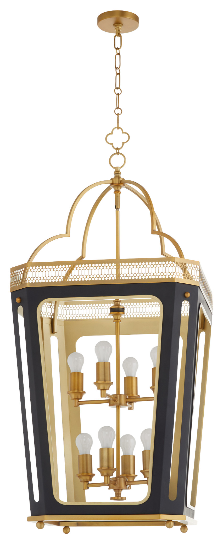 Tamara Day’s Loire lanterns for Quorum, available in brushed brass or matte black with brushed brass accents, have a more traditional look. Their oversize frames have a classic center stem and are topped with a scalloped crown, a clover finial and ornate fretwork.