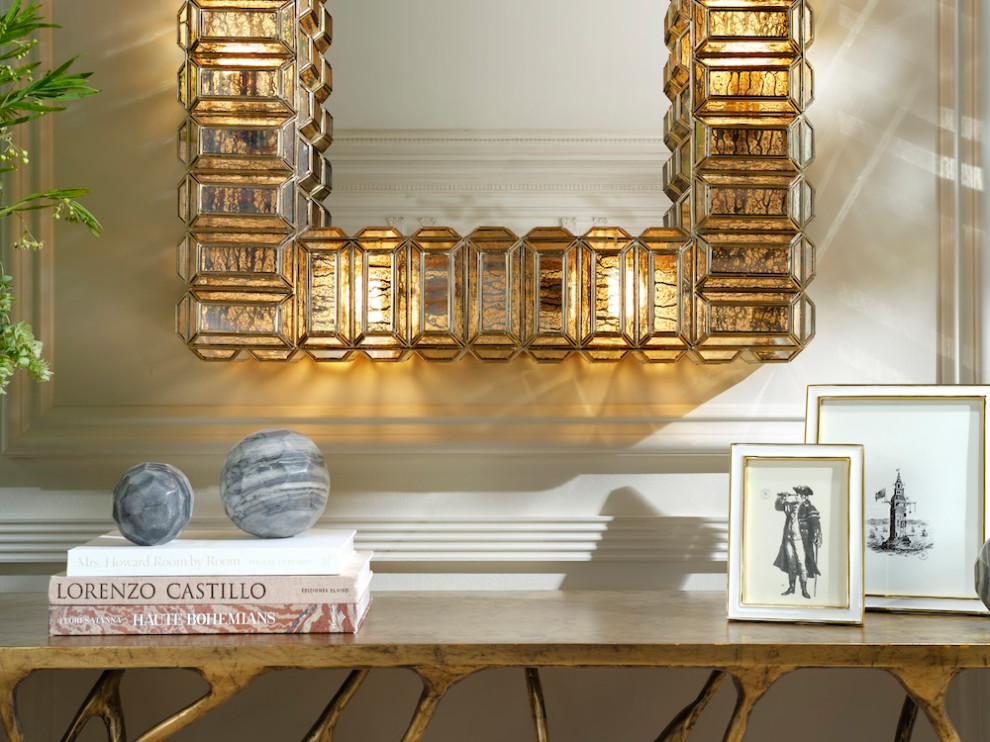 At Fine Art Handcrafted Lighting, the Mayu collection was inspired by cocoons and the notions of “softness, transformation and nurturing potential” that they evoke, according to the press release. Each “cocoon” contains intricate bubbles and delicate striations that reflect the handblown glass’ masterful construction. Meanwhile, Currey & Co., whose lighting collections were full of florals, shells and feathers, described the gold blossoms of its crocus-inspired Hortensia sconce as opening “toward slender bulbs as if they are growing toward the sun.”