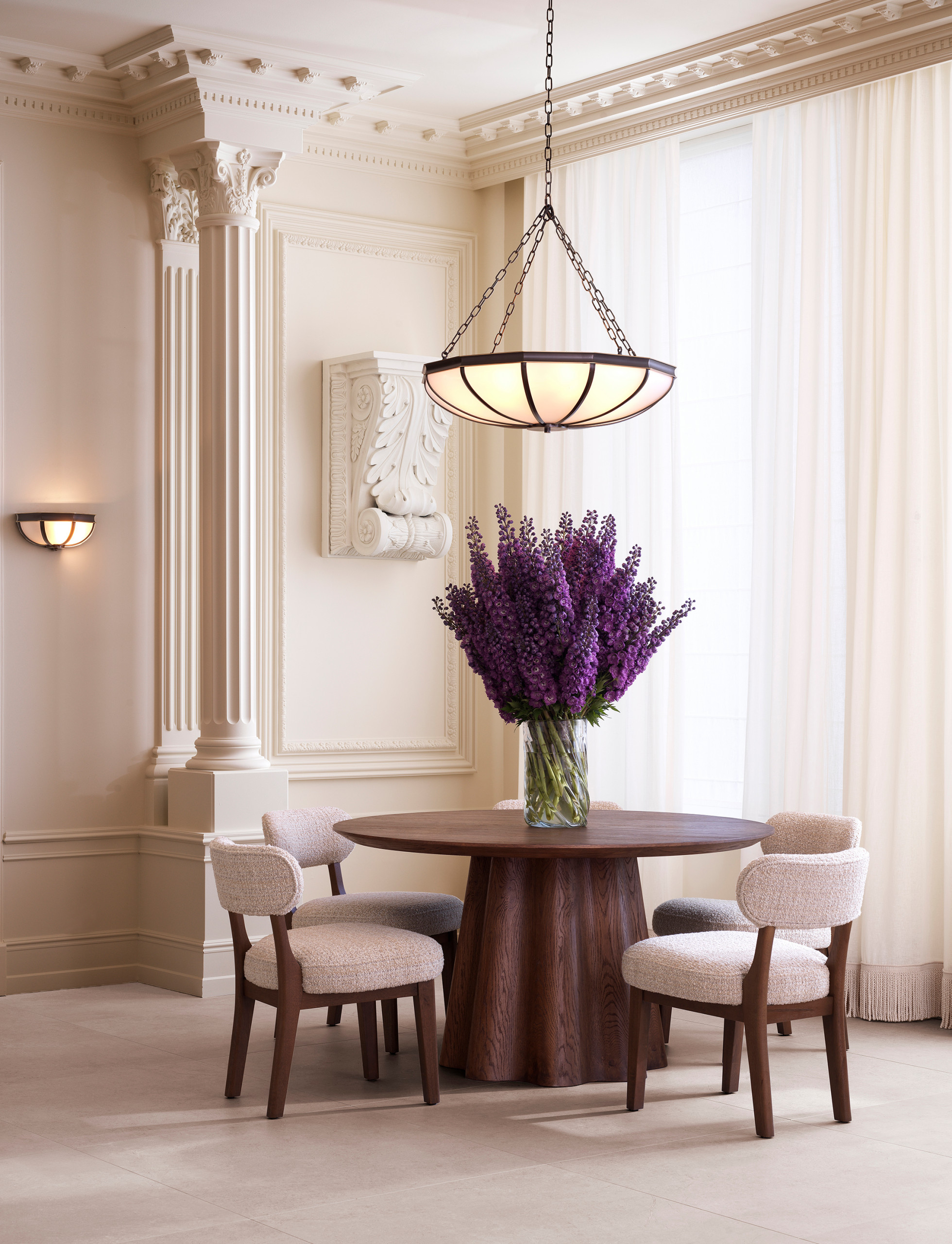 The new Jenkins chandelier, which has a commanding and classically influenced look, is from the third collection in Eichholtz’s ongoing collaboration with the Metropolitan Museum of Art in New York. Available in two sizes, the bronze-and-white-glass bowl pendant is said to be inspired by the original lighting in the museum’s Beaux Arts-style Great Hall, which opened in 1902.