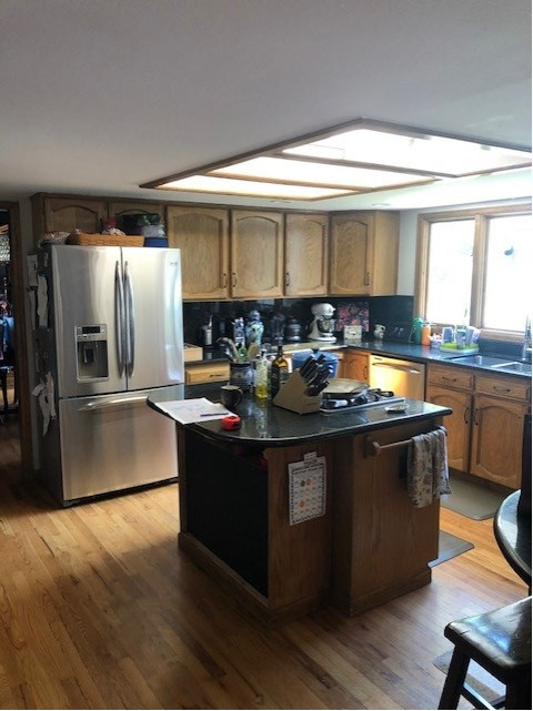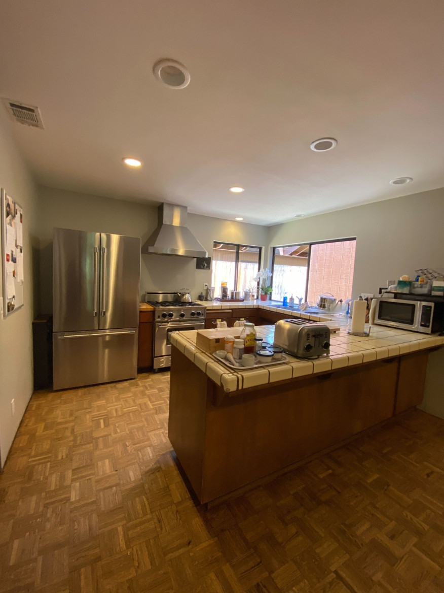 Before: A bulky peninsula separated this Northern California kitchen from the dining room. The countertops were hard-to-clean, dated-looking tile. Adequate storage was lacking. And parts of the parquet floor had popped up. The homeowners hired Kellie Love to design a space where they could comfortably cook together while hanging out with family and friends.