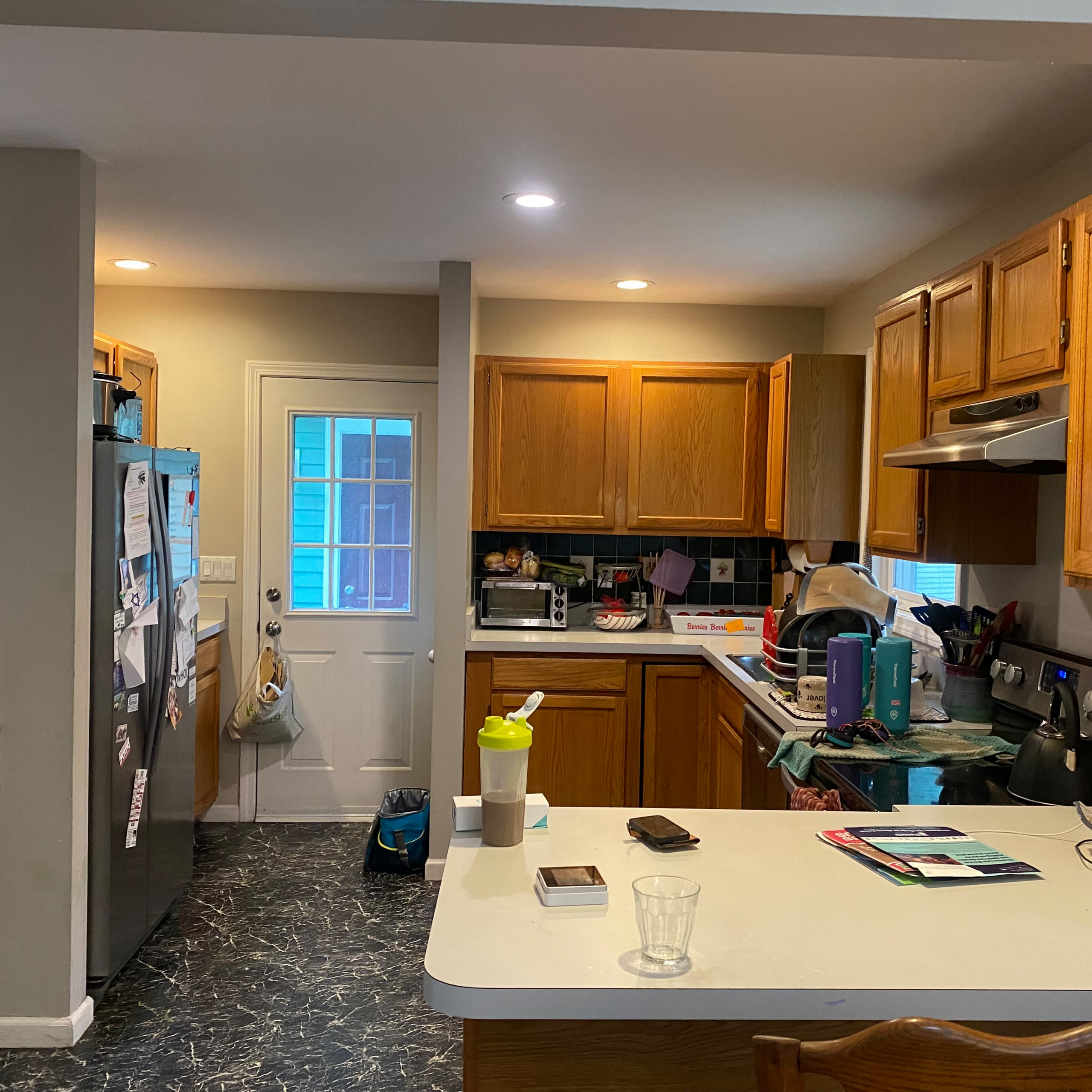 Before: At 125 square feet, this kitchen for a Massachusetts family of four felt cramped. Located in a 1992 New England Cape-style home, it also lacked sufficient storage and was cut off from both the dining area (behind the refrigerator wall seen here) and the living room (on the side of the peninsula where this photo was taken from). As for the style, honey oak cabinets combined with bland beige laminate countertops and overly busy vinyl flooring didn’t help matters. The homeowners tapped designer Kerri Reesey for the makeover.
