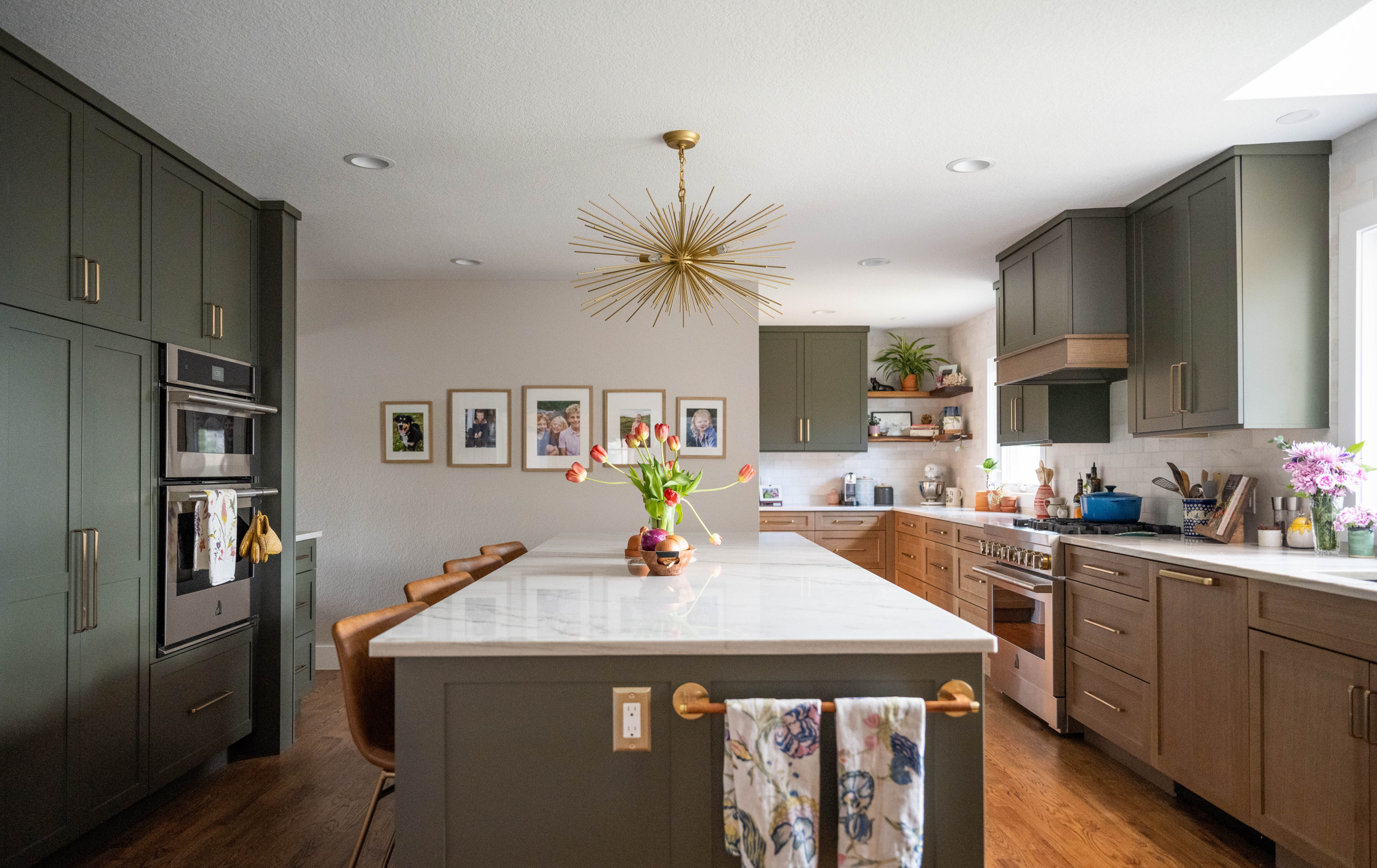 Warmth comes through in the existing oak floor, which Parker had resanded and stained, and in lower perimeter cabinets made of rift-cut white oak. But the former wood-based blandness has been banished by generous expanses of green cabinetry, and a Sputnik-style chandelier brings a burst of energy.