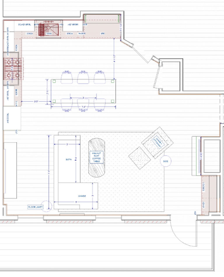 Floor plan: The plan illustrates how the rooms fit together. The kitchen is in the top left corner and the living room bar is in the bottom right corner. Repeating the cabinetry, colors and other finishes created a pleasing cohesion between the two rooms within the open space.