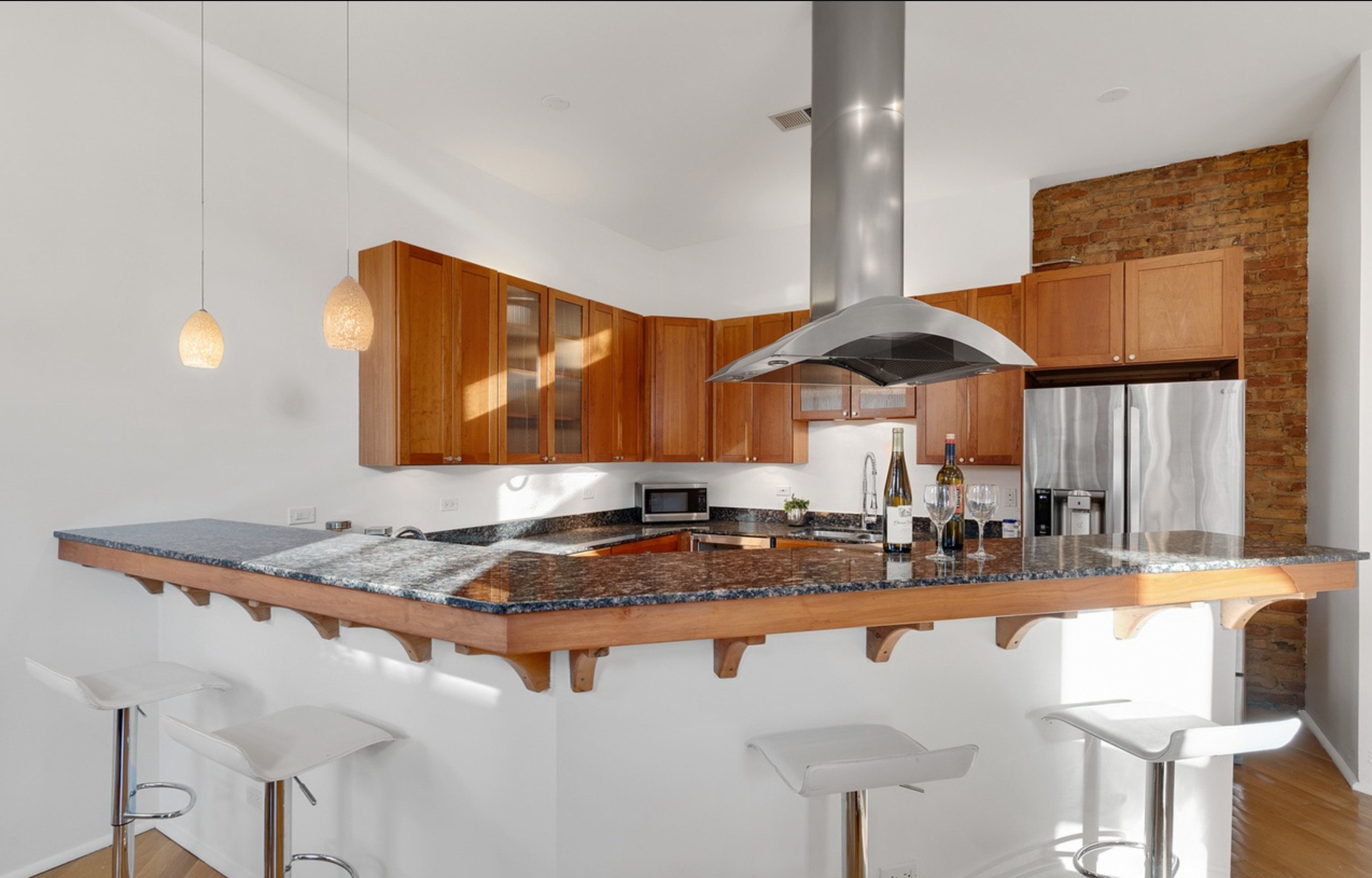 This couple purchased a pied-à-terre in Chicago’s Holden Block building, an Italianate-style landmark dating back to the rebuilding period following the 1871 Great Chicago Fire. Designed by architect Stephen Vaughn Shipman and built in 1872, the building is a standout, as many other Chicago commercial loft buildings were demolished to make way for skyscrapers. Its ornately carved Buena Vista sandstone facade earned it landmark status. The building’s conversion to residential condos in the 1990s was thoughtful, but the original kitchen in this unit did not celebrate the building’s history or architecture.