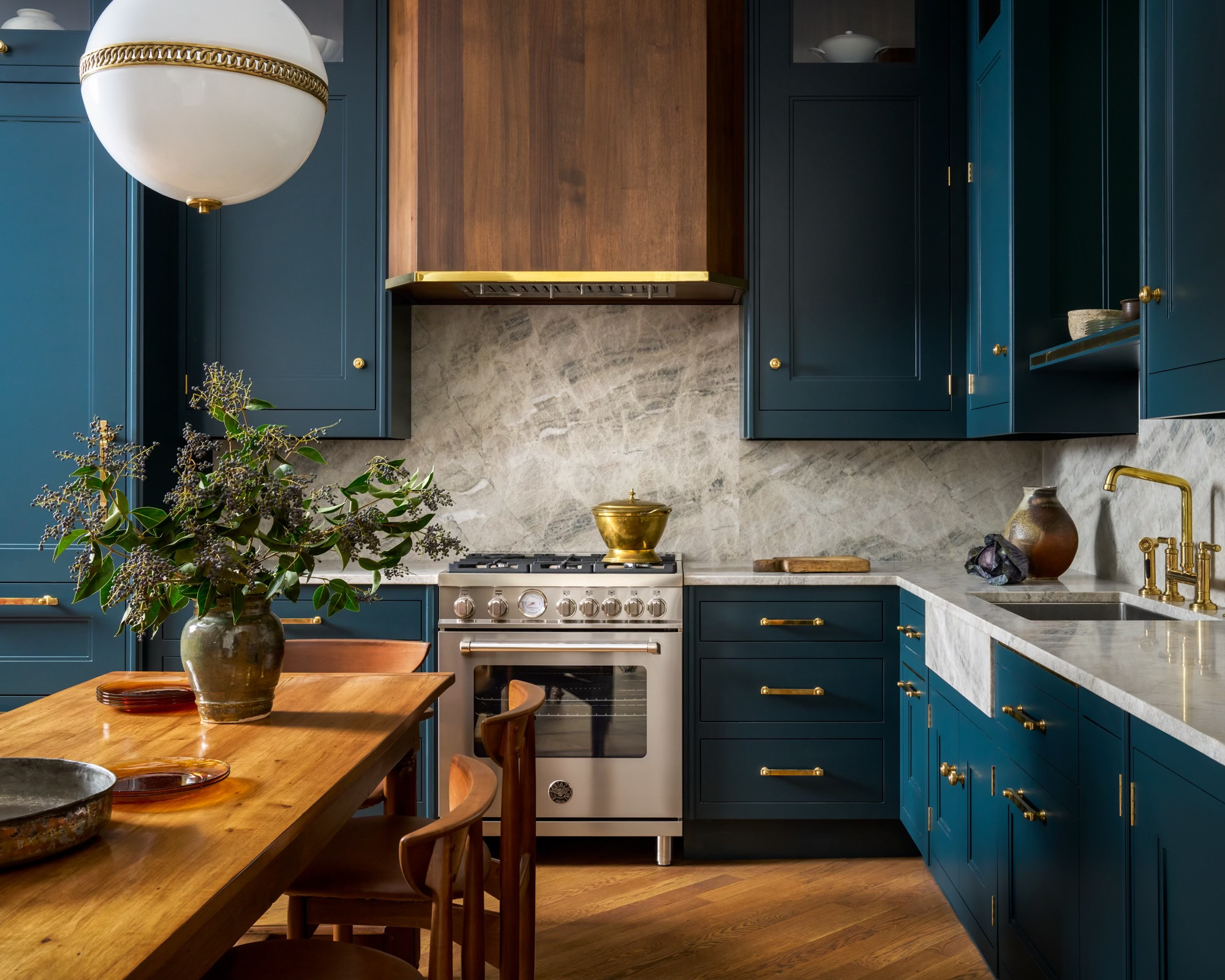 The owners brought in trusted designer Laura O’Brien of O’Brien Harris, who had designed two other kitchens for them in the past. The first kitchen she designed for them was classic white, while the second featured dramatic black. “This time they were ready for something entirely different — a moody, colorful space that embraces color in a way that feels timeless and unexpected,” O’Brien says. The new kitchen nods to the building’s industrial history and its elegant facade.