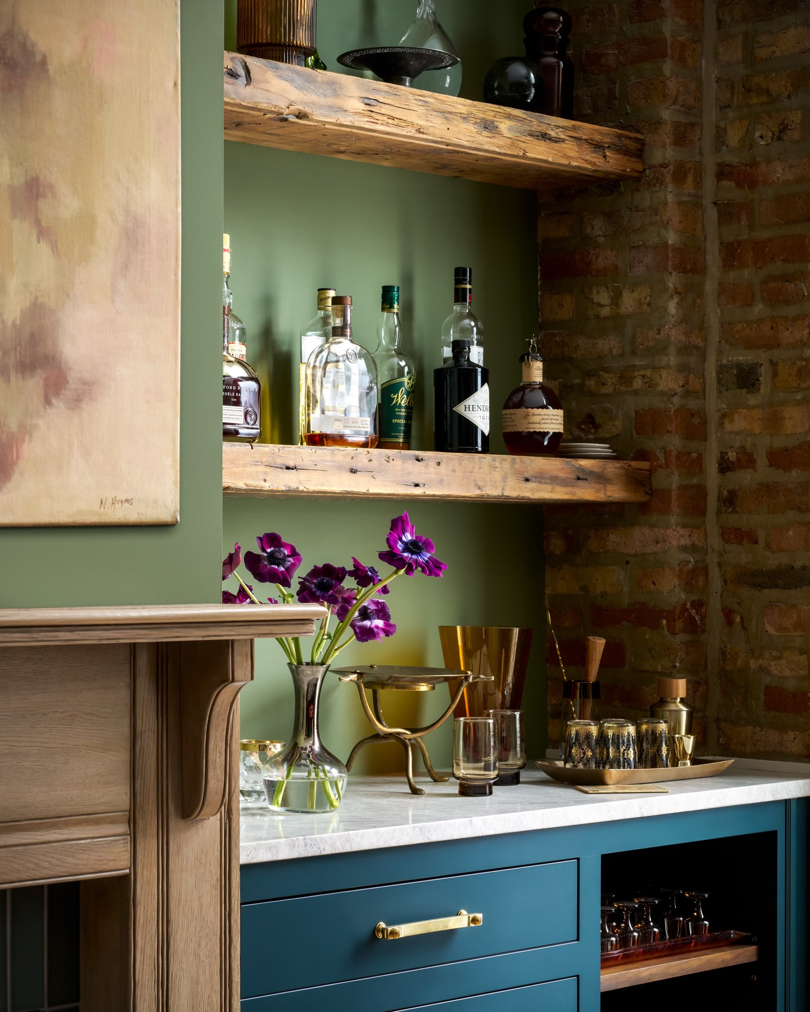 The designers repurposed wood from the original mantel and used it to fashion the bar’s shelves, which add another dash of industrial style that nods to the building’s history. Vintage brass items echo the brass used in the kitchen.
